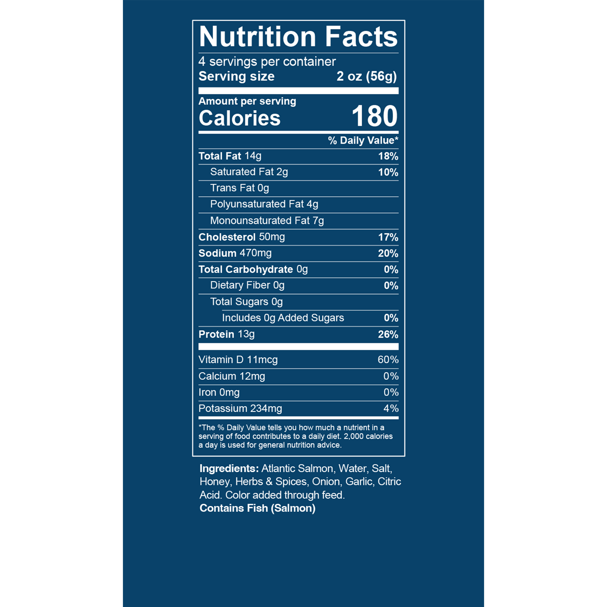 Atlantic Salmon, Water, Salt, Honey, Herbs & Spices, Citric Acid, Garlic, Onion. Color added through feed. Contains Fish (Salmon)