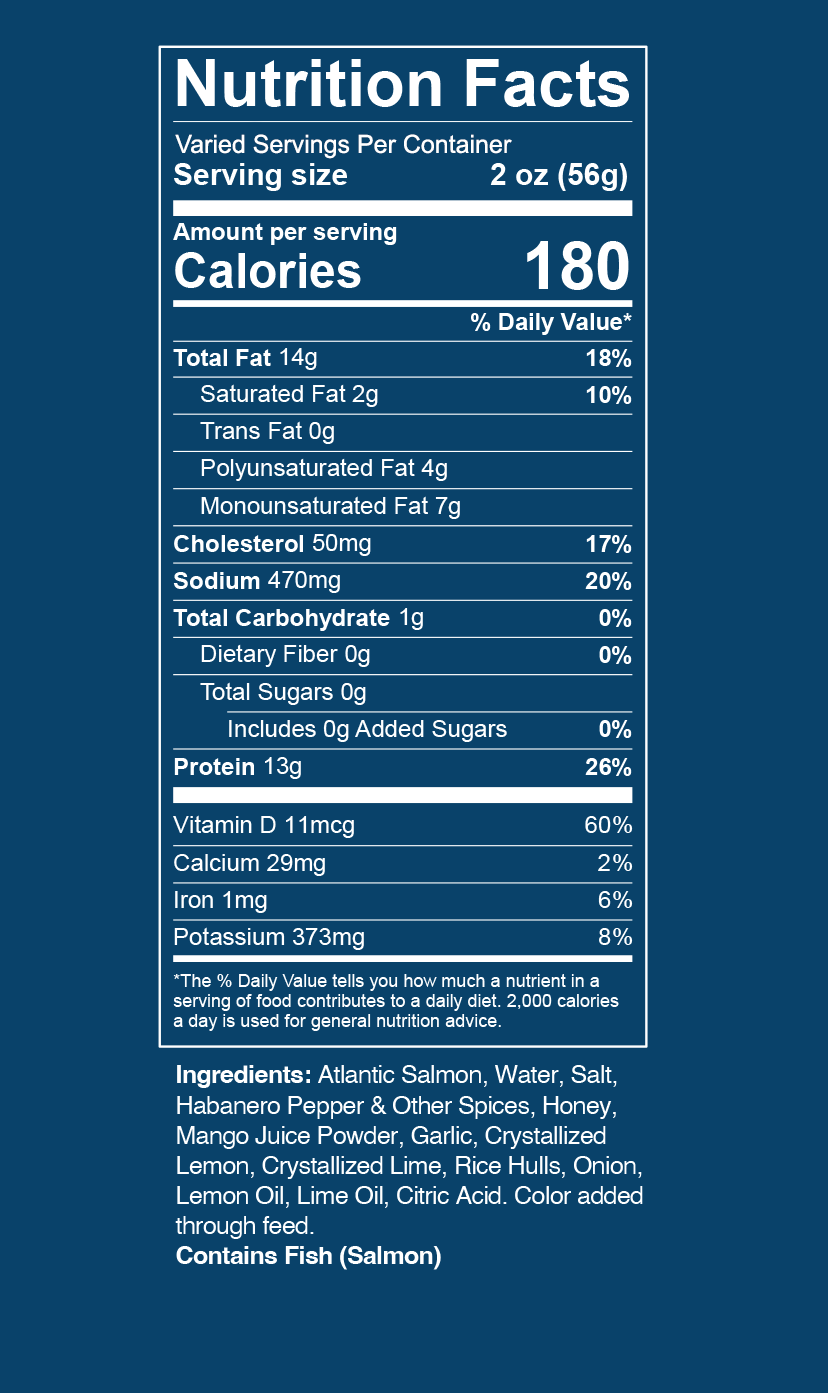 Atlantic Salmon, Water, Salt, Honey, Mango Powder, Herbs & Spices, Lemon Juice Powder, Garlic, Chili Pepper, Citric Acid, Habanero Chili Pepper, Lemon Oil, Lime Oil. Color added through feed. Contains Fish (Salmon)