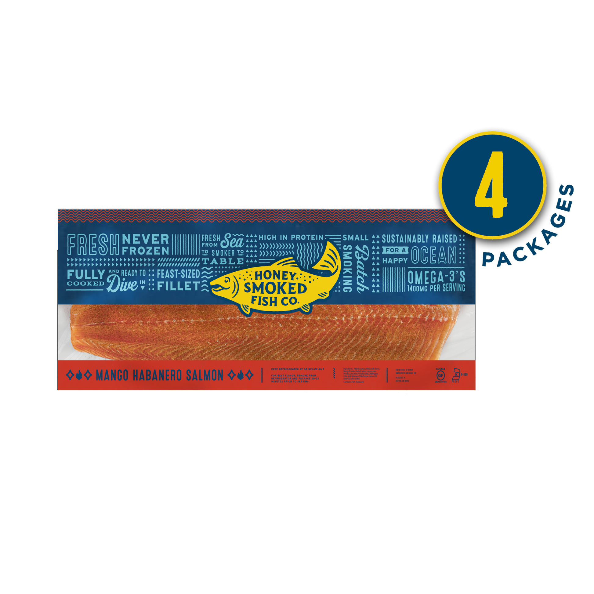 with four packages of Whole Sides (approx. 3.5lbs each package, 14lbs total) of our delicious Mango Habanero Honey Smoked Salmon®