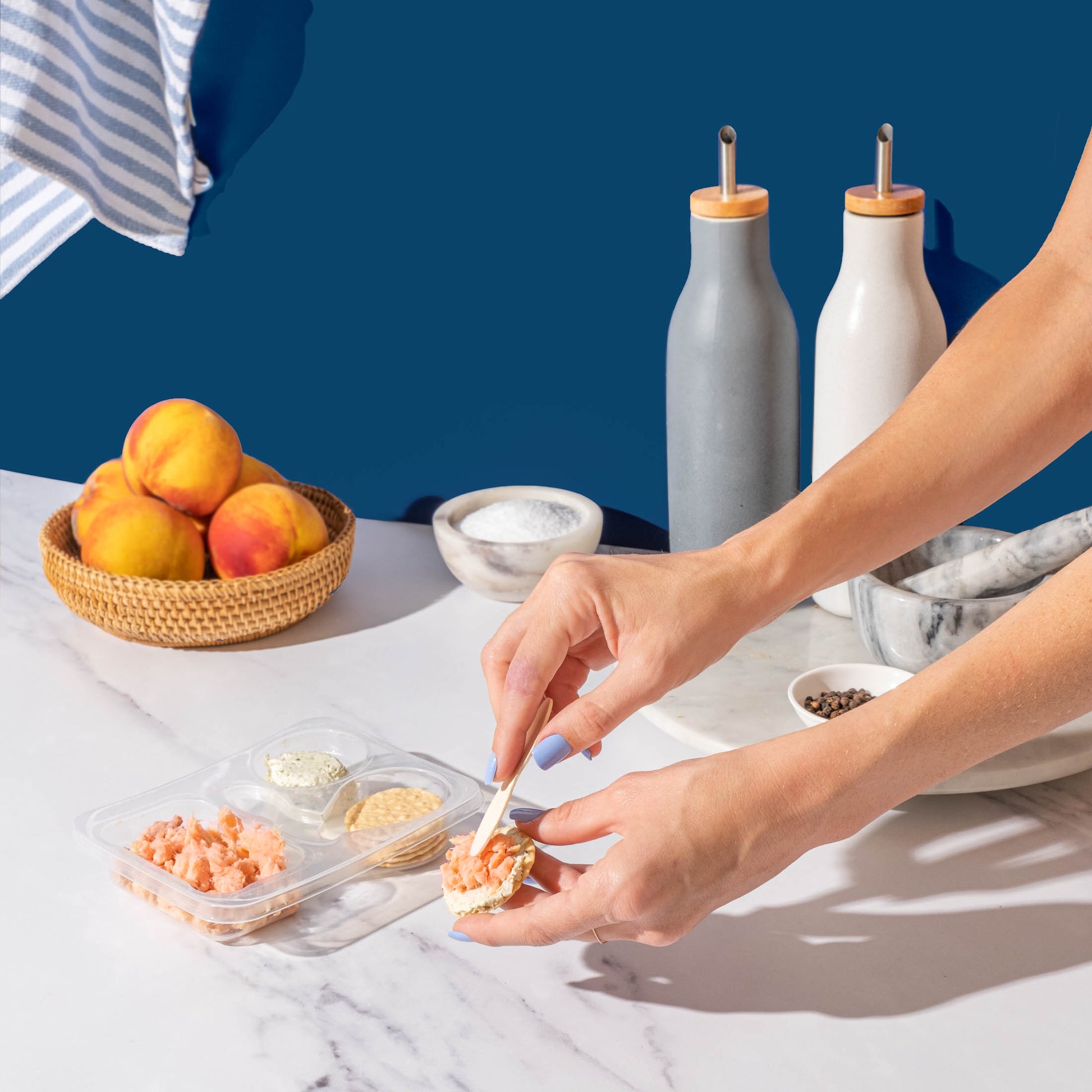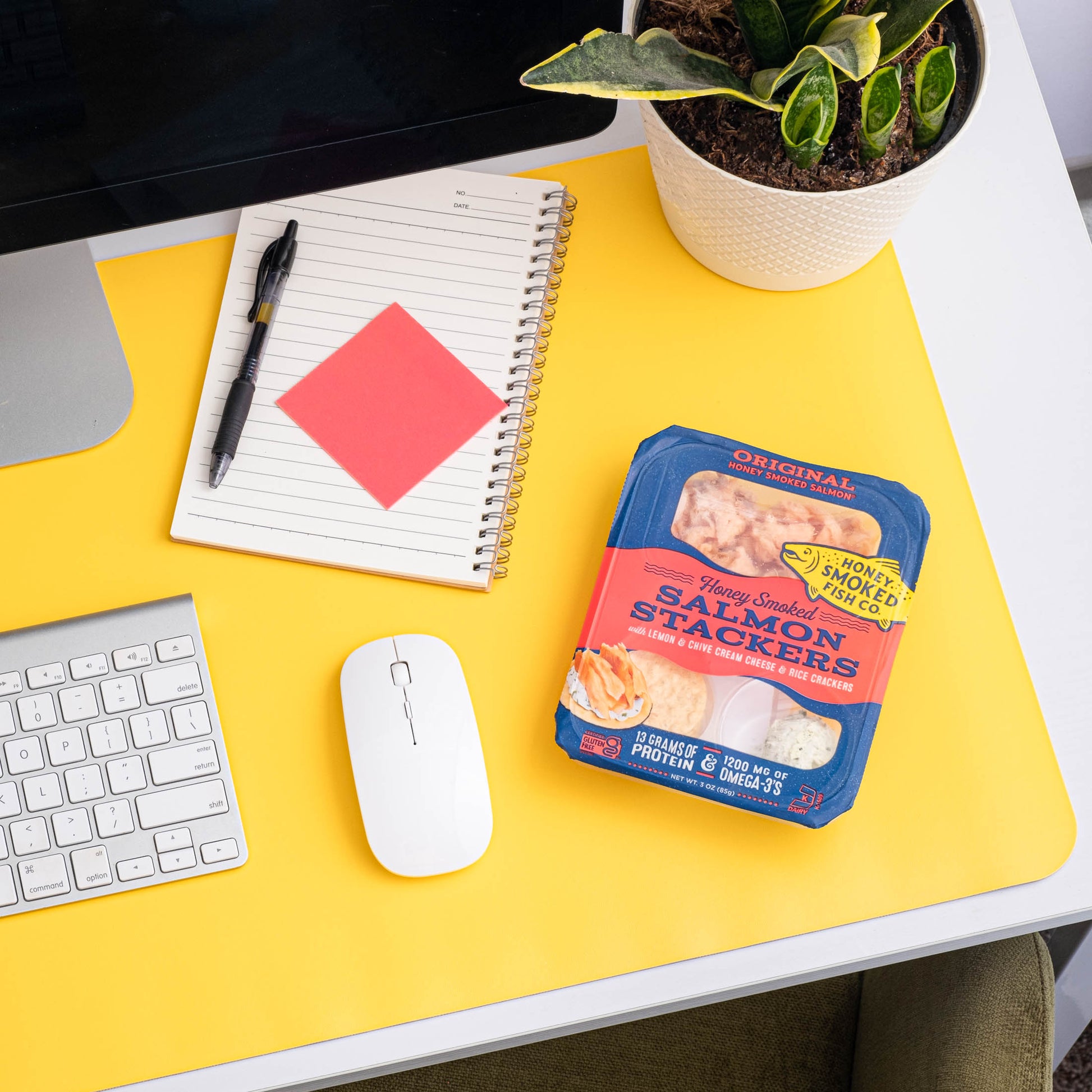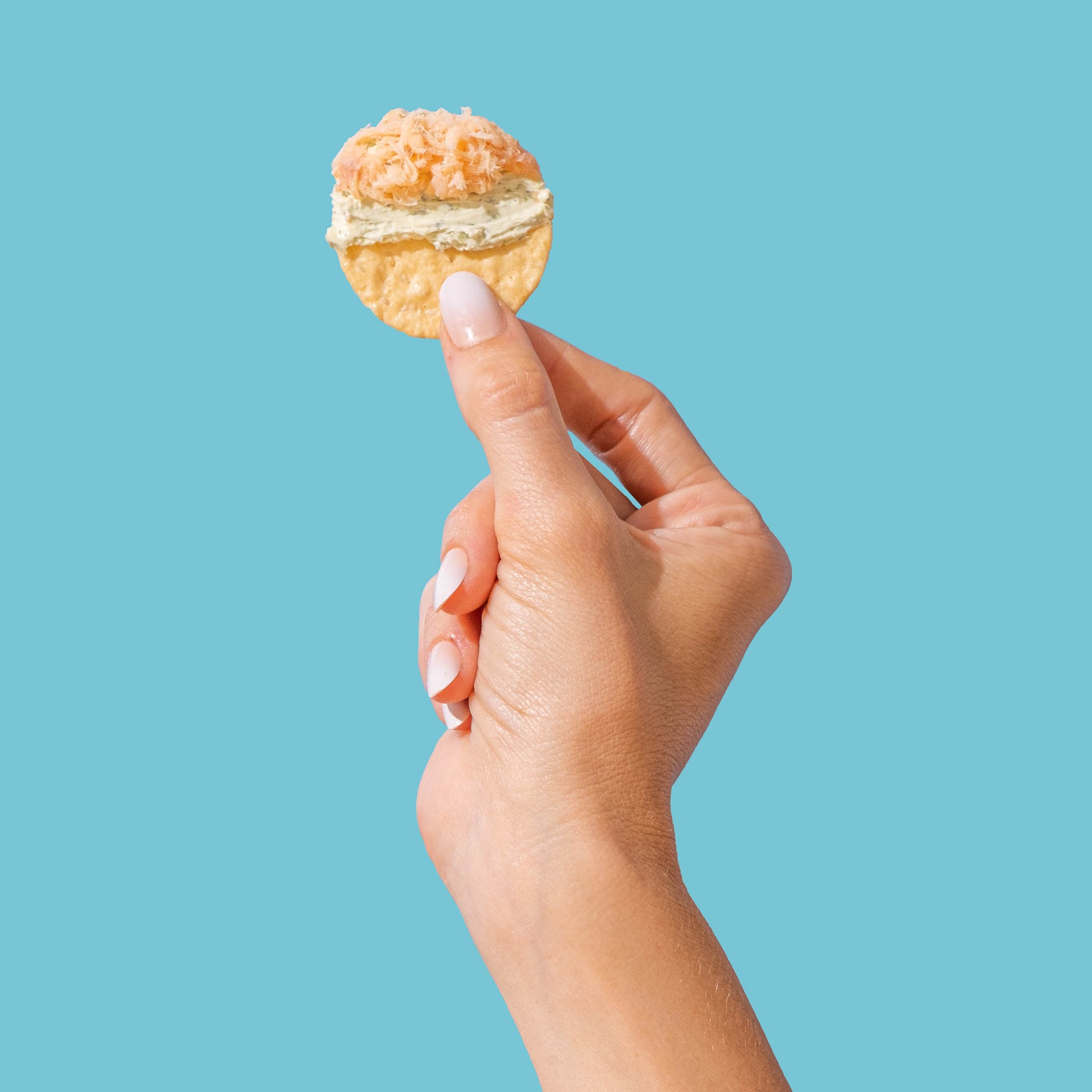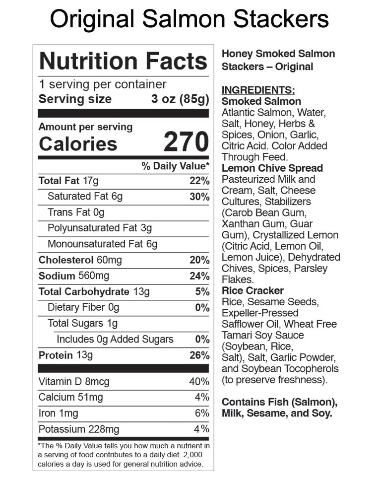 Try our NEW Salmon Stackers! Flakes of our Honey Smoked Salmon® paired with lemon & chive spread sits on top crispy rice crackers creating the ultimate snack.