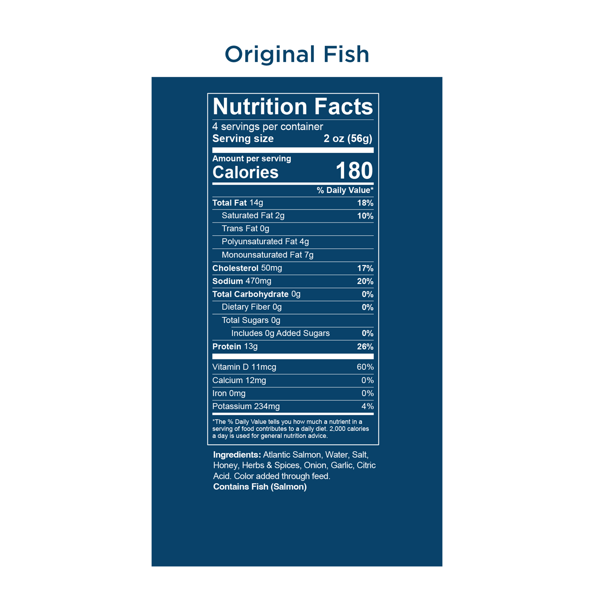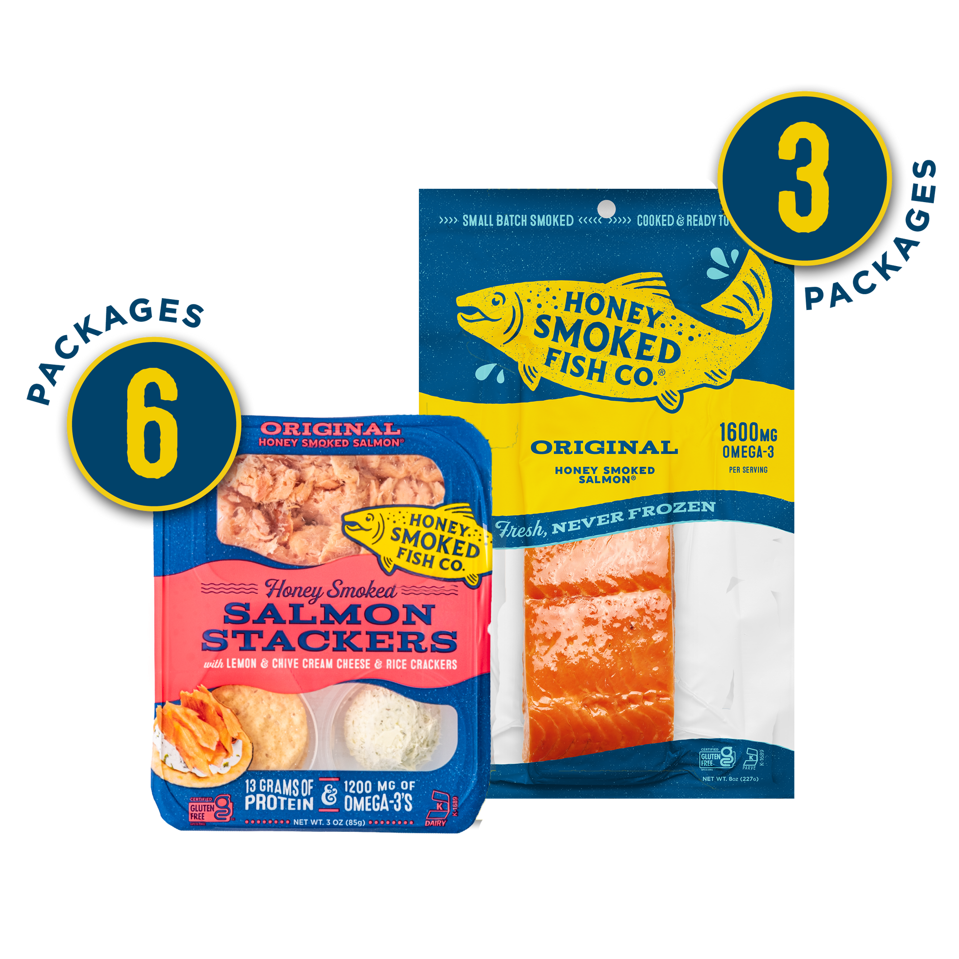 with Three 8oz fillet packages of our delicious Original Honey Smoked Salmon® and Six packages of our NEW Original Salmon Stackers.