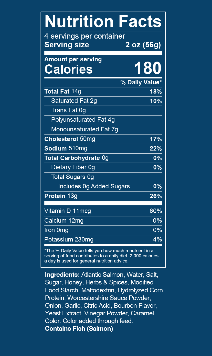 Atlantic Salmon, Water, Salt, Honey, Seasoning [Sugar, Salt, Maltodextrin, Modified Food Starch, Hydrolyzed Corn Protein, Spices, Worcestershire Sauce Powder (Distilled Vinegar, Molasses, Corn Syrup, Salt, Caramel Color, Garlic Powder, Sugar, Spice, Tamarind, Natural Flavor. Contains Sulfites), Dehydrated Garlic, Dehydrated Onion, Bourbon Flavor (Acacia Gum, Sugar, Natural Flavor), Yeast Extract, Distilled White Vinegar Powder, Caramel Color], Herbs & Spices, Citric Acid, Garlic, and Onion. Color added through feed