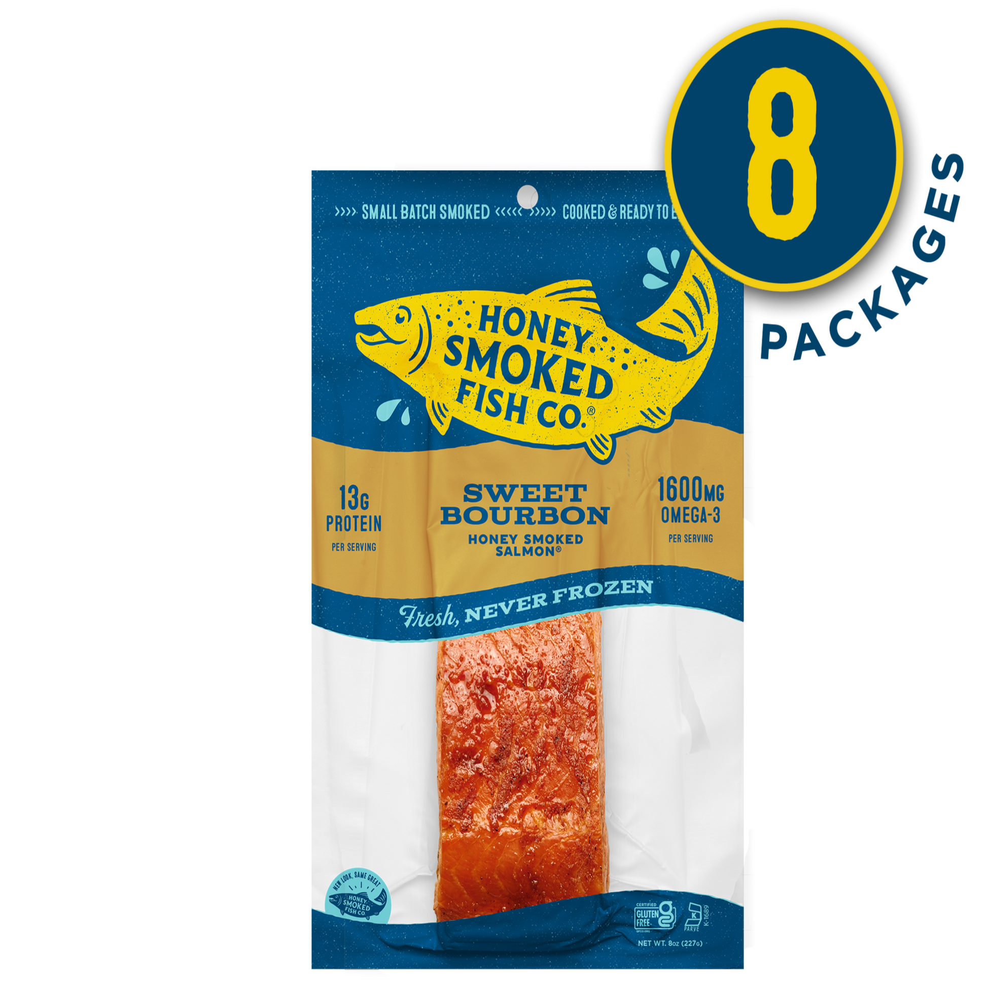 with eight packages of 8oz fillets (64oz/4lbs total) of our delicious Sweet Bourbon Smoked Salmon®